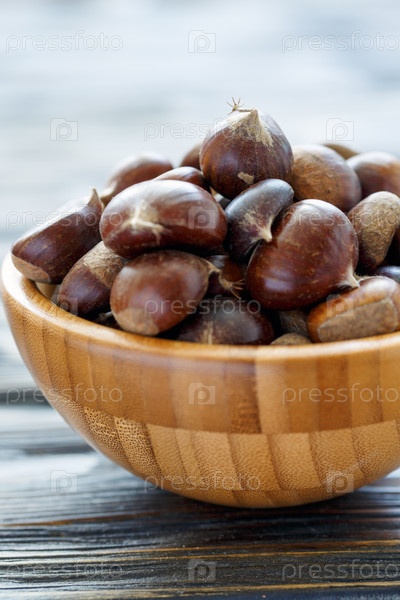 Свежие каштаны в деревянной миске