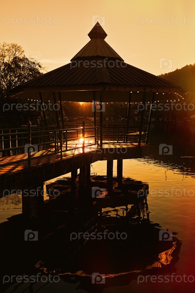Павильон на пруду в свете заката