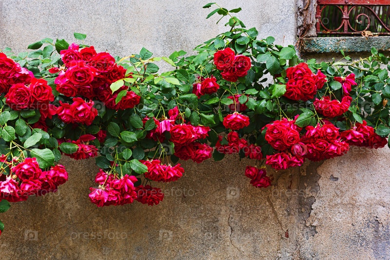 Цветущий розовый куст на стене