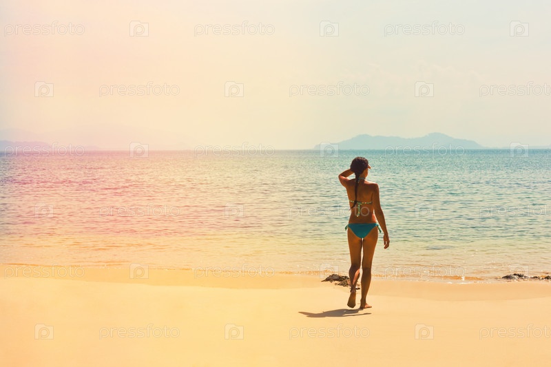 Девушка в купальнике на пустом тропическом пляже