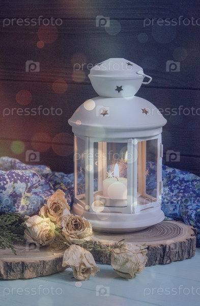 Белый фонарь и высушенные розы с можжевеловыми ветвями