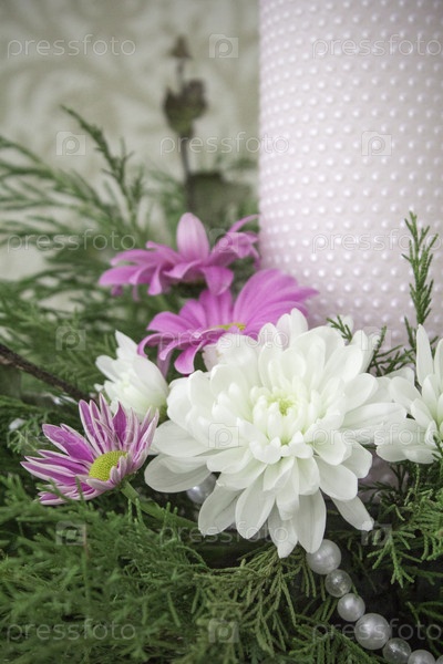 Белые и розовые хризантемы с плющом и можжевеловыми ветвями