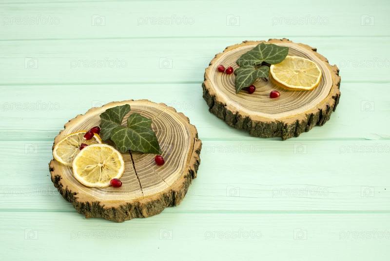Спил древесины с ломтиками лимона и гранатом