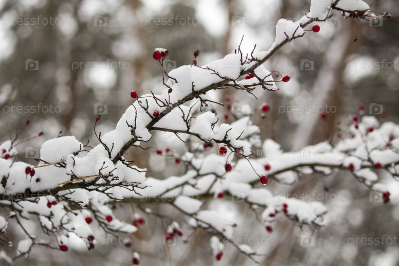 Ветка шиповника в снегу