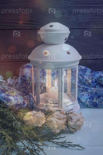 Белый фонарь и высушенные розы с можжевеловыми ветвями