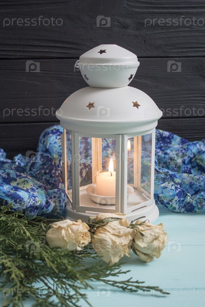 Белый фонарь и высушенные розы с можжевеловыми ветвями
