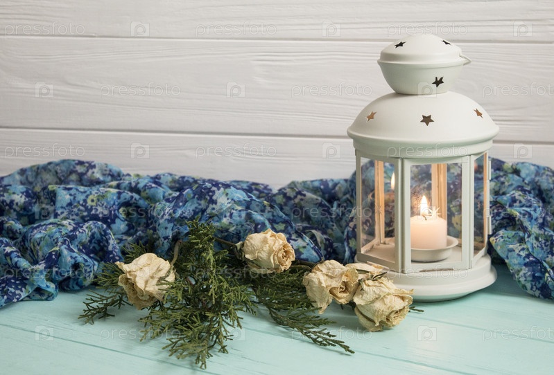 Белый фонарь и высушенные розы с можжевеловыми ветвями