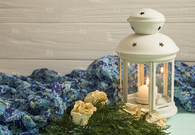 Белый фонарь и высушенные розы с можжевеловыми ветвями