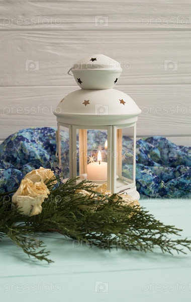 Белый фонарь и высушенные розы с можжевеловыми ветвями