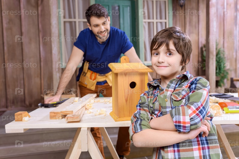 Счастливый отец и сын со скворечником