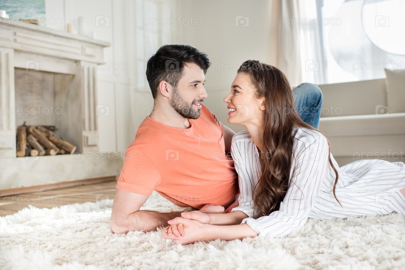 Счастливая молодая пара, лежа на ковре и глядя друг на друга