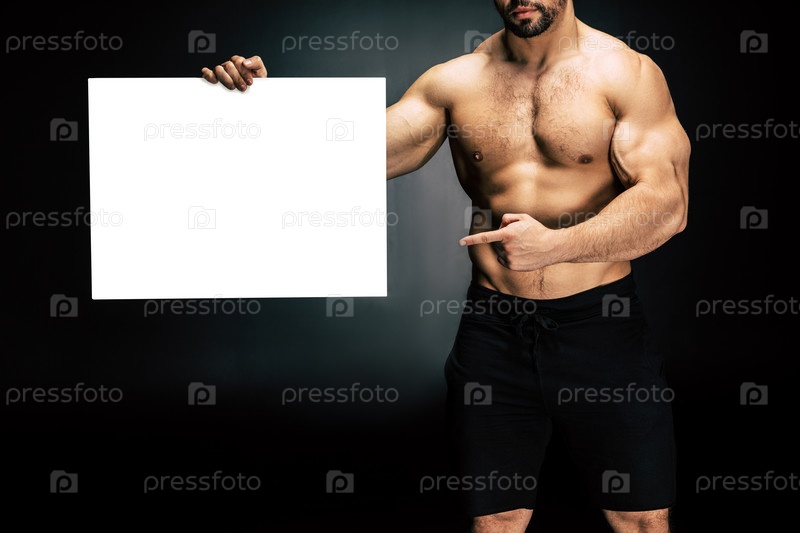 Мускулистый человек, указывая на пустой баннер в руке