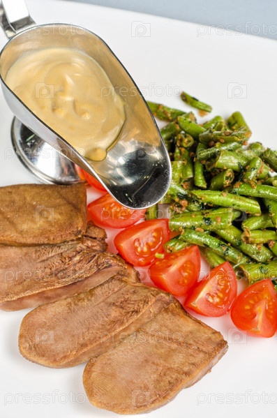Жареный говяжий язык с зеленой фасолью и помидорами черри