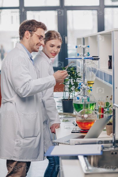 Биологи с лимонными растениями в лаборатории