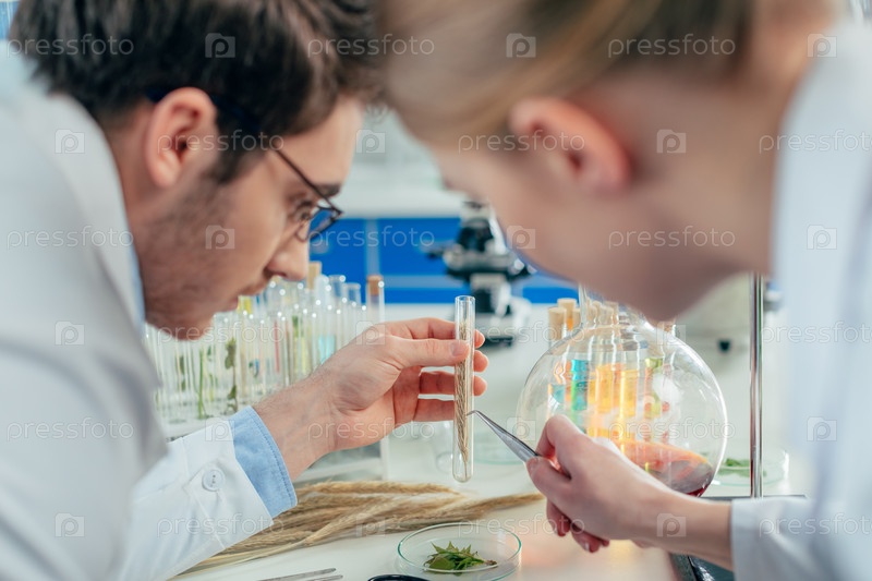Молодые биологи, работающие с пшеницей