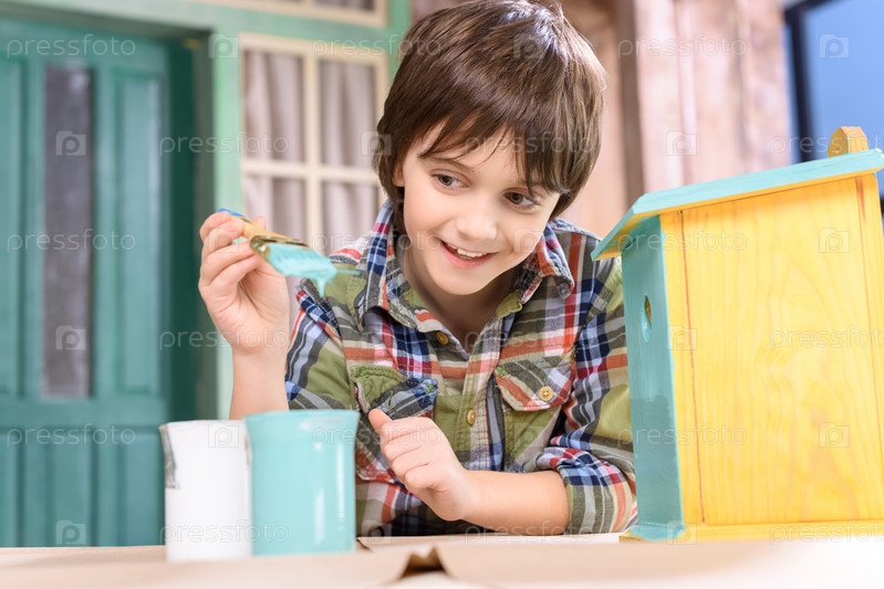 Мальчик красит скворечник