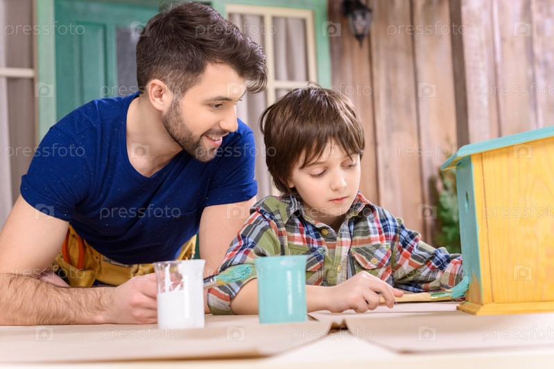 Счастливый отец, глядя на сконцентрированного сына