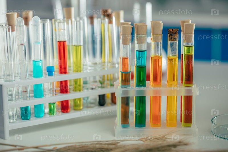 Красочные реагенты в колбах на столе в биологической лаборатории