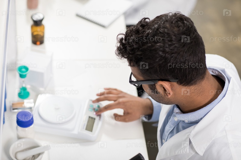 Молодой ученый, работающий с электронными весами в научно-исследовательской лаборатории