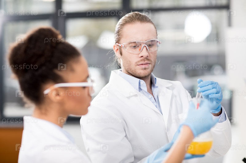 Вид сбоку сконцентрированных ученых, анализирующих пробирки в лаборатории