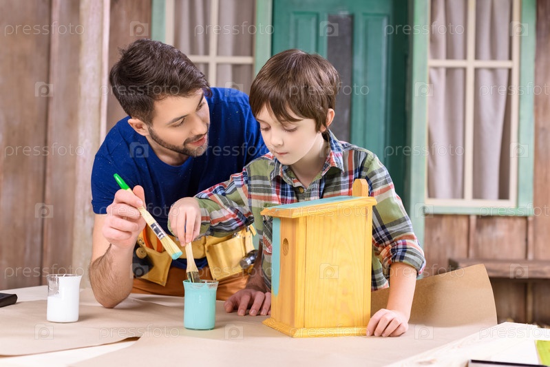 Сконцентрированный отец и сын красят скворченик