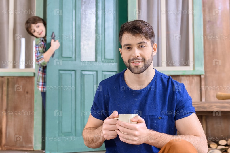 Мужчина на крыльце с чашкой чая