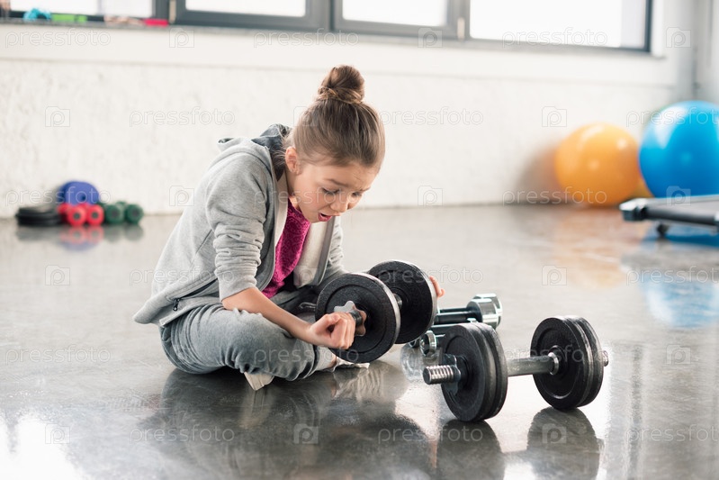 Потрясенная маленькая девочка с гантелями