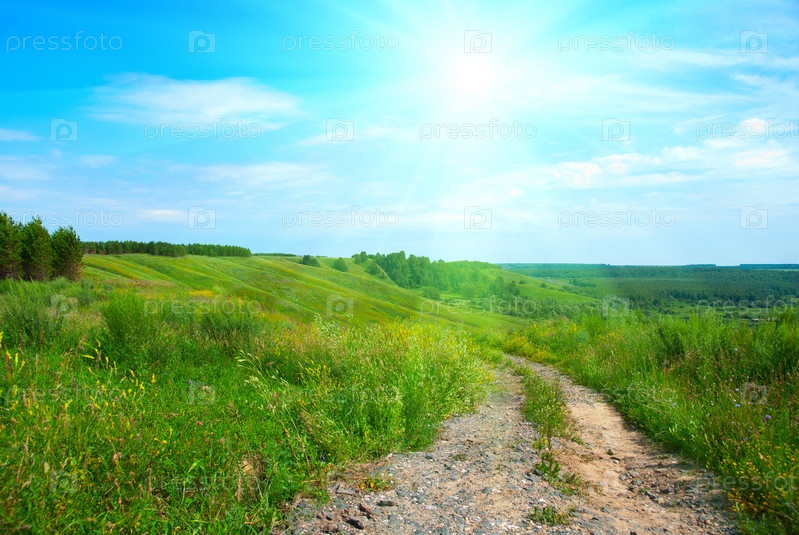 Летний пейзаж с зеленой травой, тропой и солнечным голубым небом