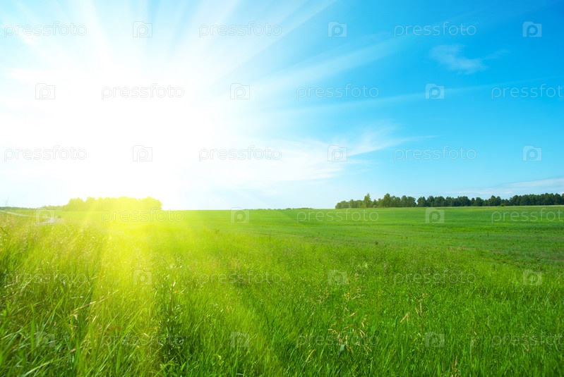 Зеленое поле под солнечным голубым небом