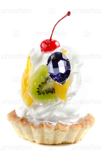 Кекс со взбитым кремом, фруктами и ювелирным кольцом на белом фоне