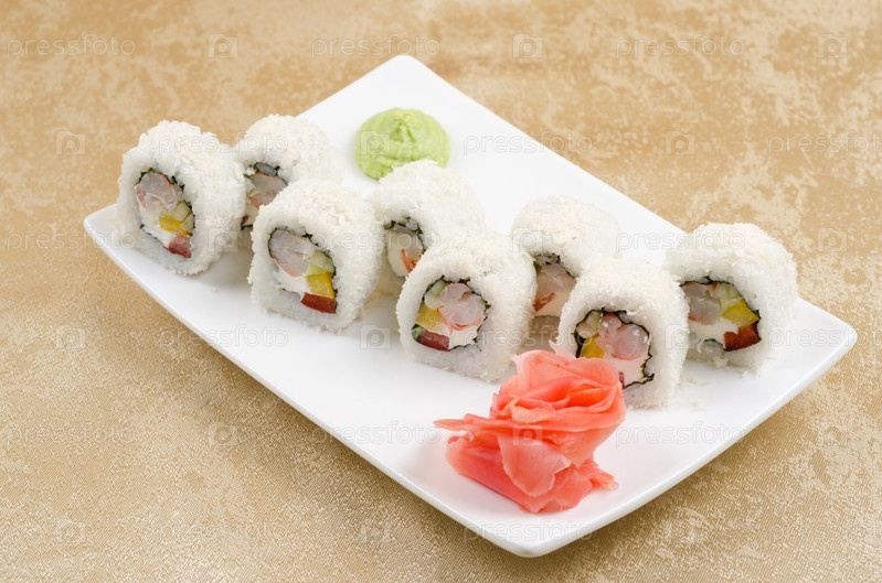 Суши из креветок, огурца и перца