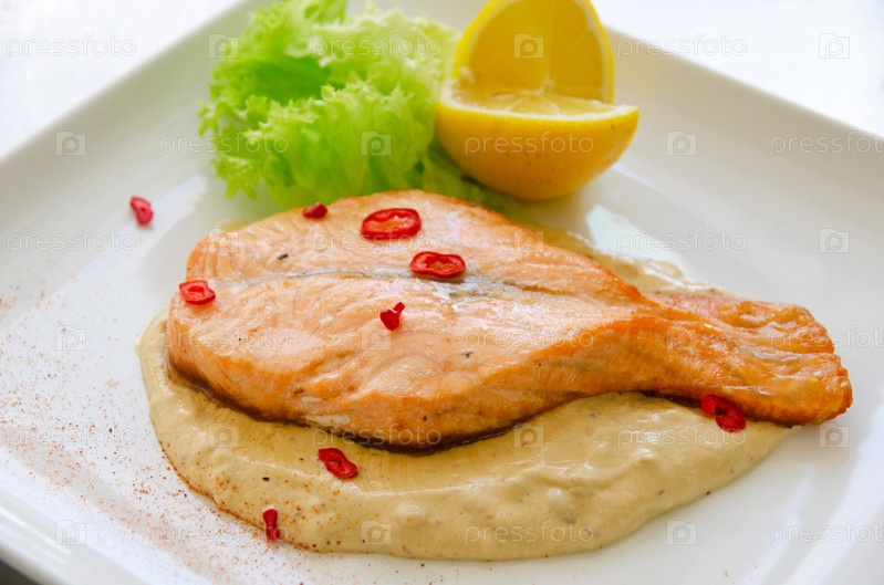 Лосось с зеленью, лимоном, соусом и перцем чили