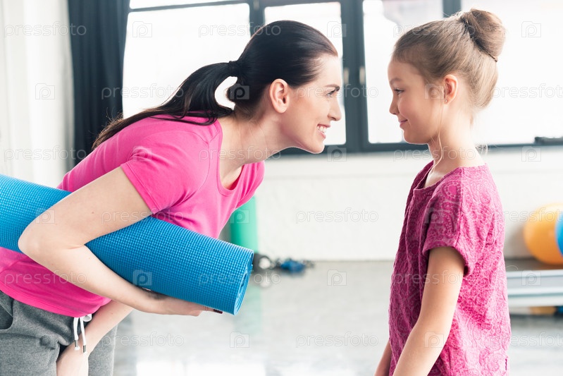 Мать и дочь с ковриком для йоги