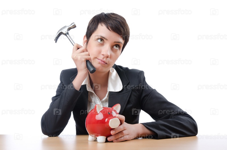 Женщина с копилкой на белом фоне