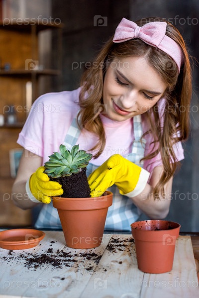 Женщина пересаживает растение