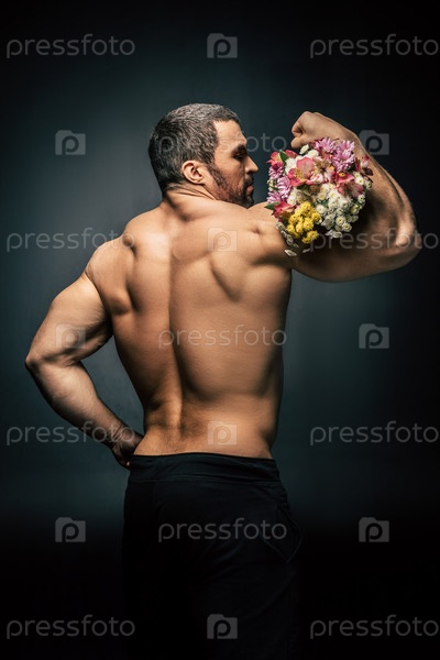 Мускулистый мужчина с букетом цветов