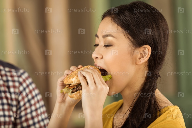 Девушка кушает бургер