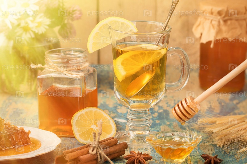 Стеклянная чашка чая с лимоном и медом на столе
