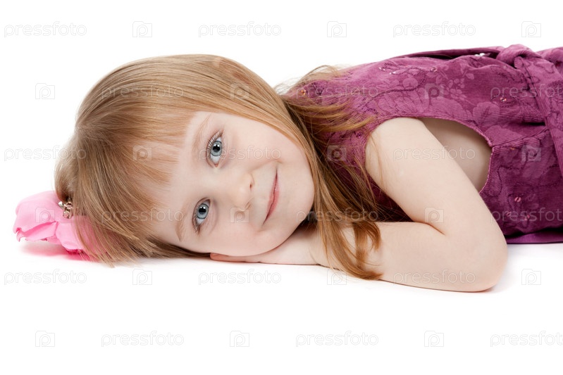 Красивая девочка в возрасте четырех лет лежит на полу на белом фоне