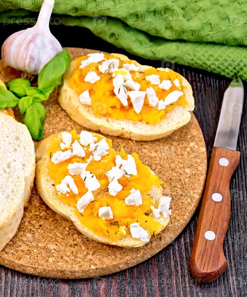 Брускетта с тыквой и брынзой на темной доске