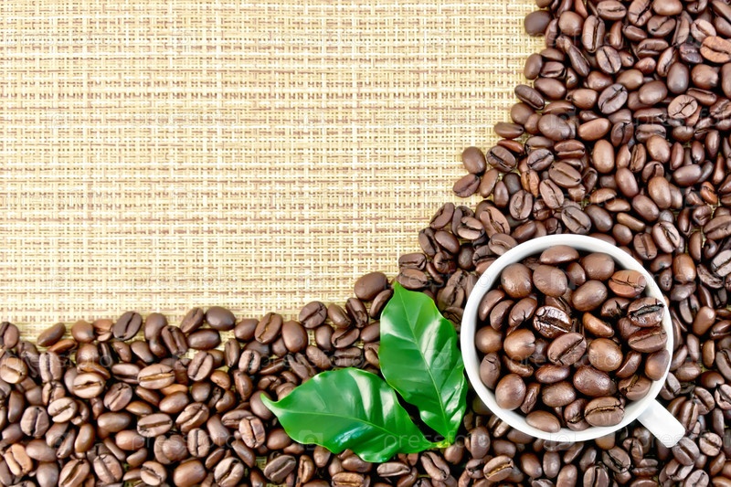 Кофе черный зерна на желтой плетеной ткани