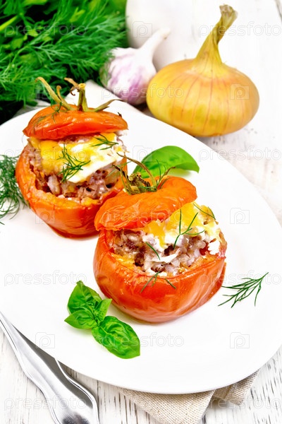 Помидоры фаршированные мясом и рисом в тарелке на доске