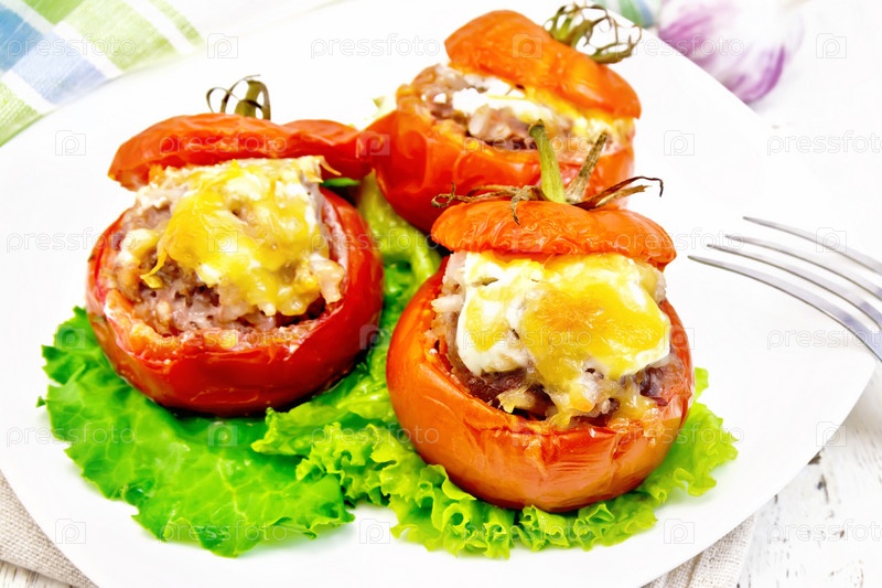Помидоры фаршированные мясом и рисом с салатом в тарелке на доске