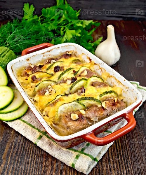 Фрикадельки с кабачками и орехами в жаровне на темной доске
