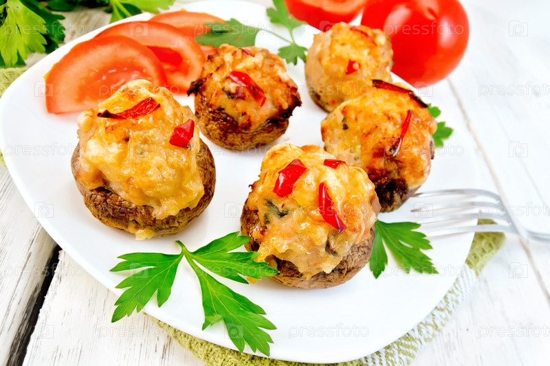 Шампиньоны фаршированные мясом и перцем в тарелке на доске