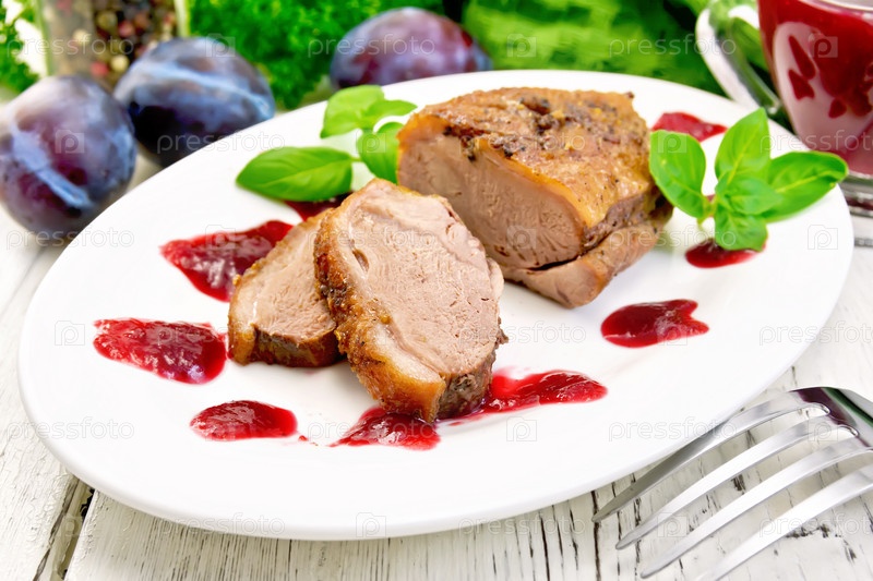 Утиная грудка со сливовым соусом в тарелке на светлой доске