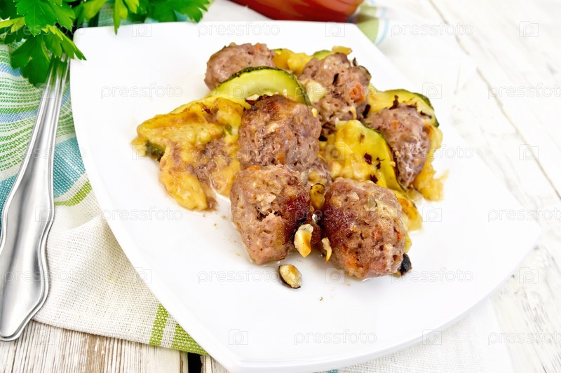 Фрикадельки с кабачками и орехами в тарелке на светлой доске