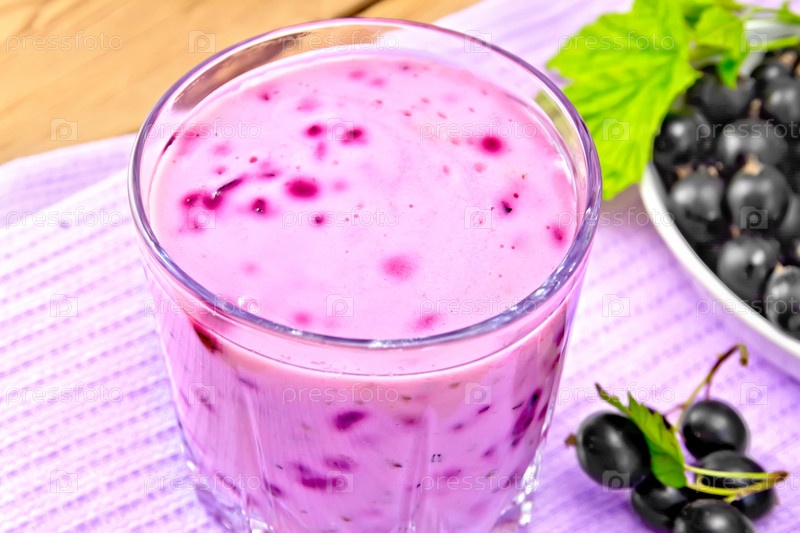 Молочный коктейль с черной смородиной в стакане на деревянной доске
