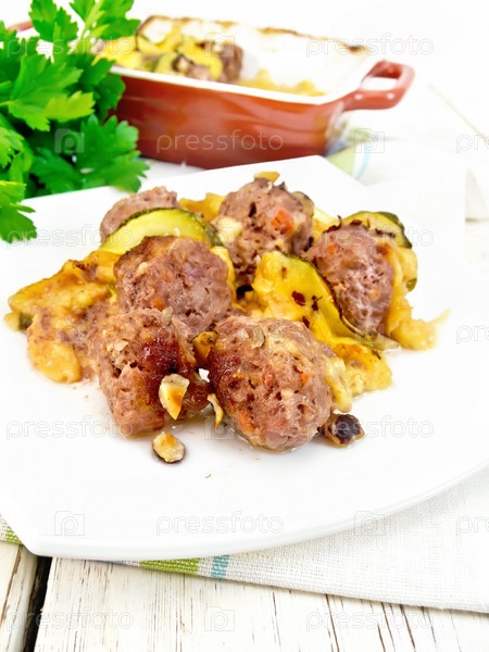 Фрикадельки с кабачками и орехами в тарелке на полотенце