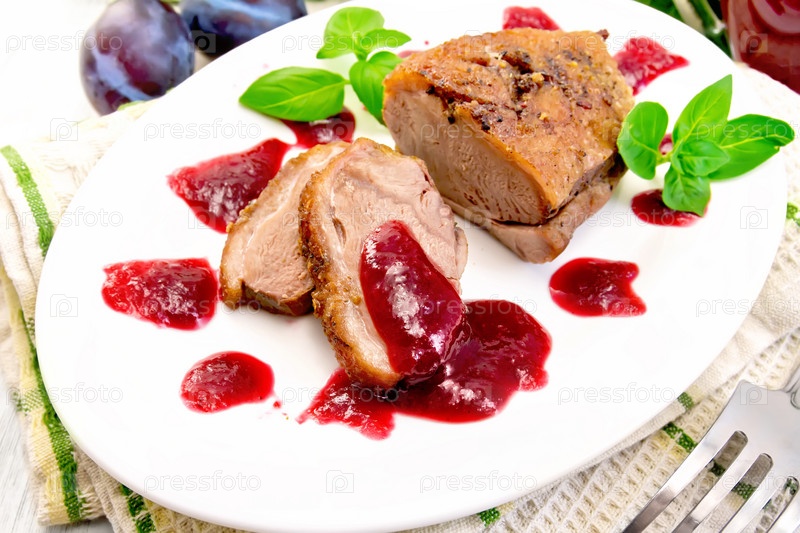 Утиная грудка с сливовым соусом в тарелке на доске
